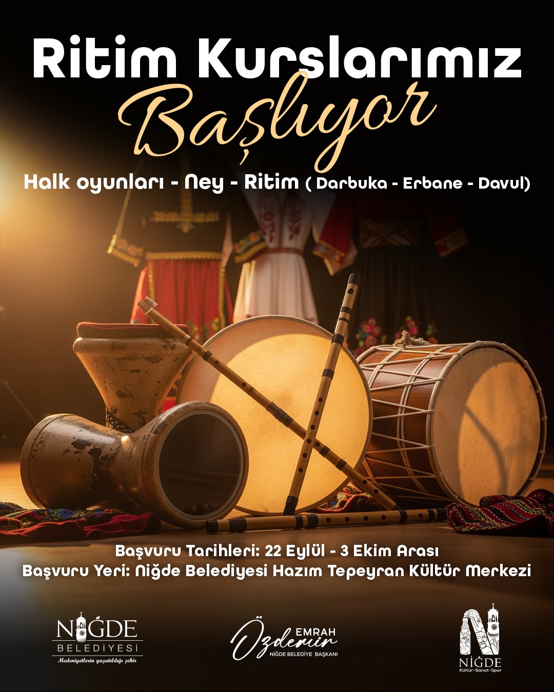 Niğde Belediyesi, kültür ve sanat faaliyetleri kapsamında yeni dönem eğitim programlarını duyurdu. Şehrin kültürel yaşamına katkı sağlayan yeni ritim, ney ve halk oyunları kursları için başvurular başladı. Müzik ve dansa ilgi duyan her yaştan Niğdeli, bu kurslarla yeteneklerini geliştirme fırsatı bulacak.