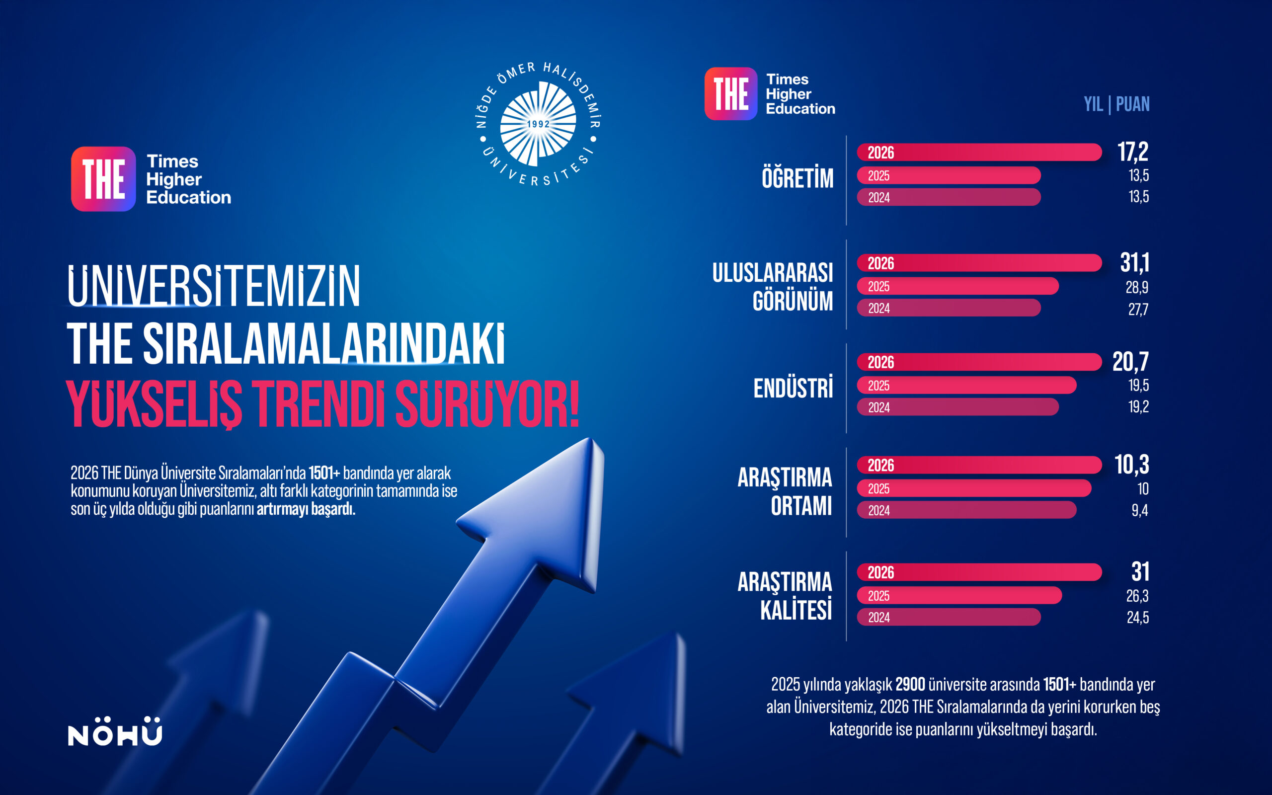 Niğde Ömer Halisdemir Üniversitesi, 2024 yılında ilk kez dahil olduğu THE Dünya Üniversite Sıralamalarına 2025 ve 2026 yıllarında da artan bir başarı grafiğiyle girmeyi sürdürdü. THE sıralaması; öğretim, araştırma ortamı, araştırma kalitesi, uluslararası görünürlük ve endüstri gibi farklı alanlarda üniversiteleri değerlendiriyor. Üniversite, bu kategorilerin her birinde puanlarını yükselterek hem akademik hem de araştırma altyapısında önemli gelişmeler kaydetti.