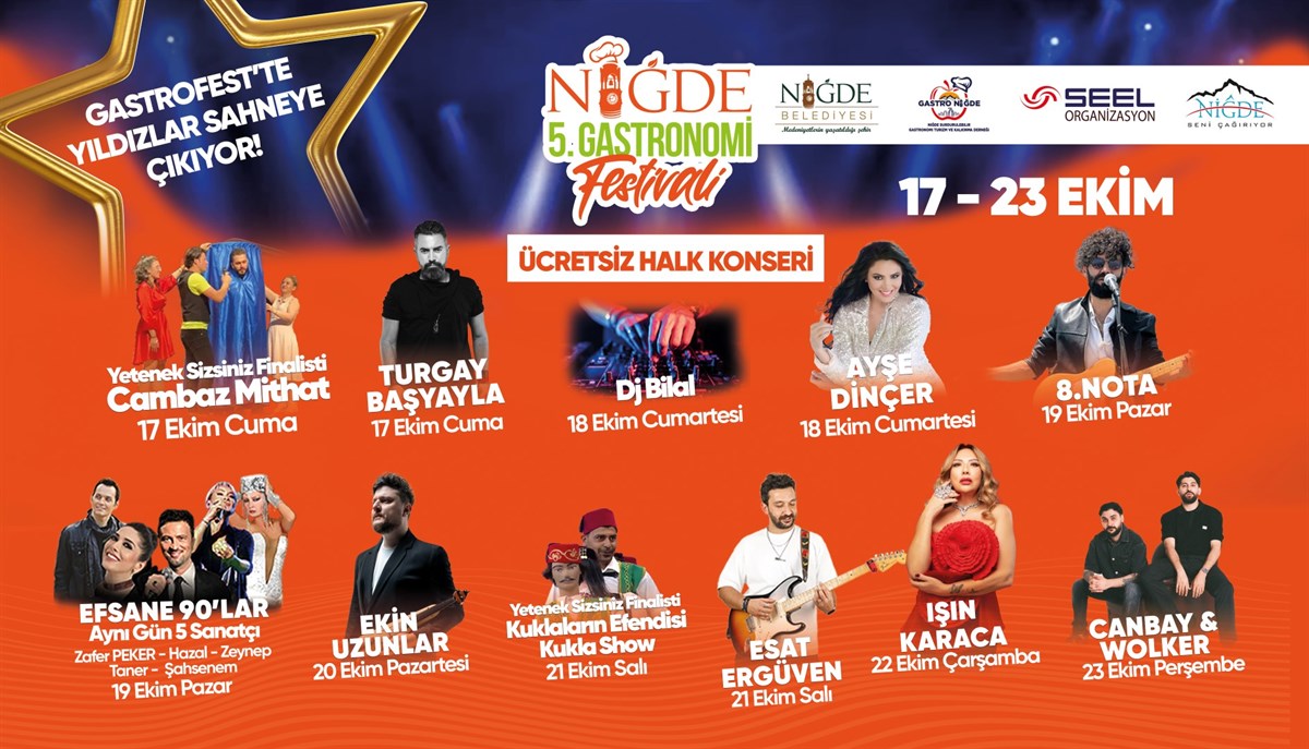 Festivalin her akşamı, Niğde halkına açık ve ücretsiz konserlerle şenlenecek. Konser öncesinde düzenlenecek yarışmalar ve ana sahnede yer alacak yerel ekipler ve Niğdeli sanatçılarla festival coşkusu doruklara taşınacak. Programın açılış gecesi 17 Ekim Cuma akşamı sahnede Turgay Başyayla ve aynı gecenin sürpriz gösterisi Cambaz Mithat yer alacak. 18 Ekim Cumartesi günü DJ Bilal’in performansının ardından müziğin sevilen sesi Ayşe Dinçer bir konser verecek. Pazar akşamı 19 Ekim’de sahnede Türkçe rock’tan örnekler sunacak 8.NOTA grubu bulunacak; bu konserin ardından 90’lar müziğinin efsane isimlerinden oluşan “Efsane 90’lar” topluluğu Zafer Peker, Hazal, Zeynep, Taner ve Şahsenem nostalji rüzgarı estirecek. Hafta başında, 20 Ekim Pazartesi akşamı Karadeniz müziğinin güçlü seslerinden Ekin Uzunlar, 21 Ekim Salı akşamı ise pop müziğin genç yeteneklerinden Esat Ergüven sahneyi paylaşacak; aynı gün yetenek gösterisi olarak “Kuklaların Efendisi” isimli kukla gösterisi de festival coşkusuna renk katacak. 22 Ekim Çarşamba günü ise güçlü sesiyle tanınan Işın Karaca konseri olacak. Festivalin kapanış günü olan 23 Ekim Perşembe günü ise rap müzik ikilisi Canbay & Wolker sahne alarak etkinliğe unutulmaz bir final yaptıracak.