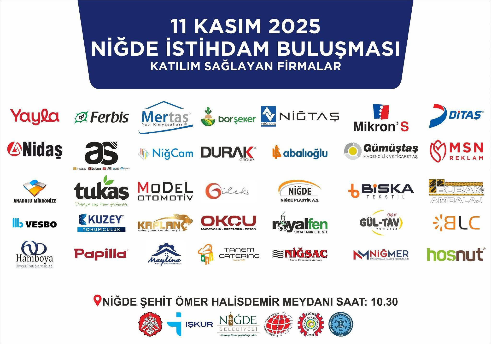 Niğde Valiliği öncülüğünde; İŞKUR, Niğde Belediye Başkanlığı, Niğde Ticaret ve Sanayi Odası ile Niğde Organize Sanayi Bölgelerinin iş birliğiyle düzenlenecek olan “Niğde İstihdam Buluşması”, 11 Kasım 2025 Salı günü saat 10.30’da Şehit Ömer Halisdemir Meydanı’nda (Niğde Belediye Başkanlığı önü) gerçekleştirilecek.