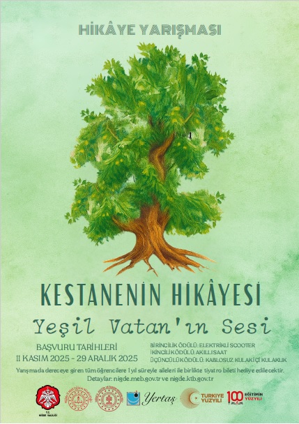 Niğde İl Kültür ve Turizm Müdürlüğü ile İl Milli Eğitim Müdürlüğü iş birliğiyle, 11 Kasım Milli Ağaçlandırma Günü kapsamında ortaöğretim öğrencilerine yönelik “Geleceğe Nefes Ol, Sevdamız Yeşil Vatan” temalı hikâye yarışması düzenleniyor.
