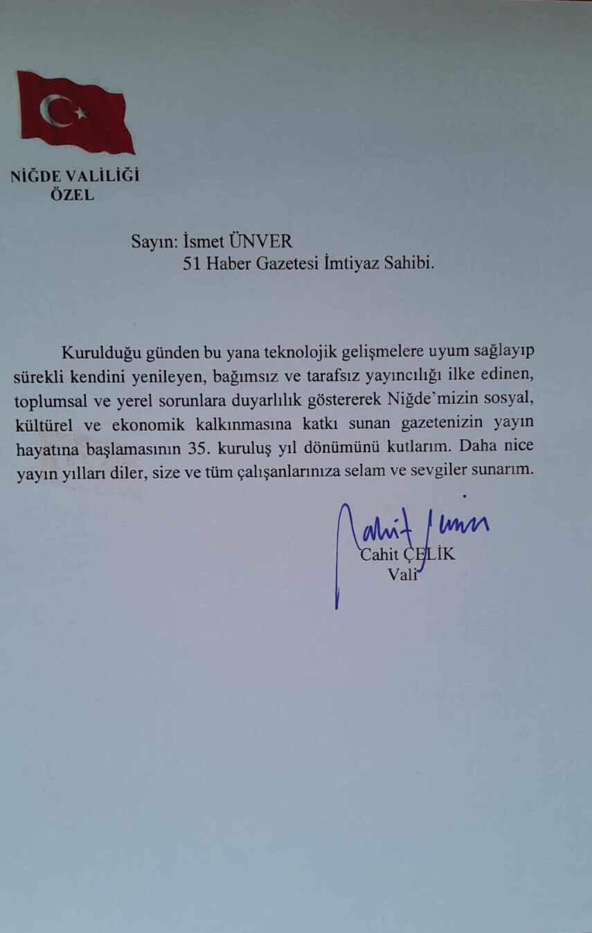 12.12.1990 tarihinde başlayan yayın hayatında 35. yılına ulaşan gazetemiz 51 Haber için Niğde Valisi Cahit Çelik bir kutlama mesajı yayımladı. Gazetemiz İmtiyaz Sahibi İsmet Ünver adına gönderilen mesajda Vali Çelik şu ifadeleri kullandı: