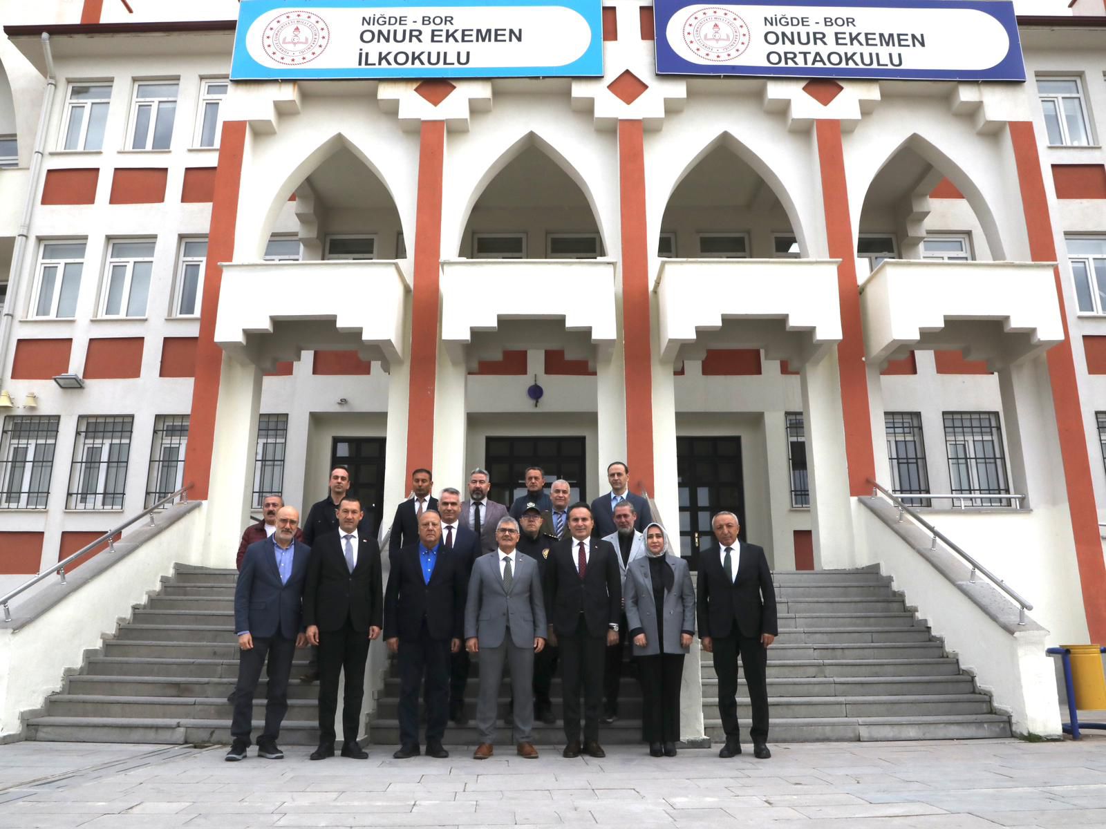 Niğde Valisi Cahit Çelik; Bor Kaymakamı Gökhan Görgülüarslan, Bor Belediye Başkanı Serkan Baran, İl Millî Eğitim Müdürü Elif Özbek, Bor İlçe Millî Eğitim Müdürü Mehmet Çalışır ve Borlu hayırsever iş insanı Atıl Ekemen ile birlikte Onur Ekemen İlkokulu ve Ortaokulu’nu ziyaret etti. Ziyaret kapsamında okul yönetimi ve öğretmenlerden eğitim-öğretim faaliyetlerine ilişkin bilgi alan Vali Çelik, sınıfları gezerek öğrencilerle yakından ilgilendi.