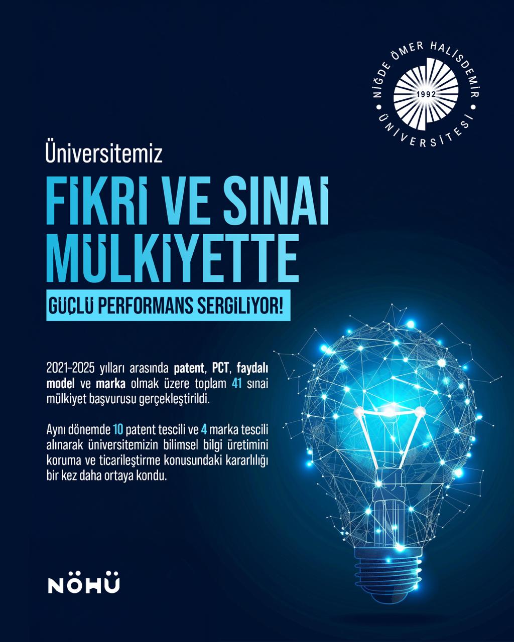 Niğde Ömer Halisdemir Üniversitesi, 2021–2025 yılları arasında patent, PCT, faydalı model ve marka alanlarında toplam 41 başvuru yaptı. Aynı dönemde 10 patent ve 4 marka tescili alındı.