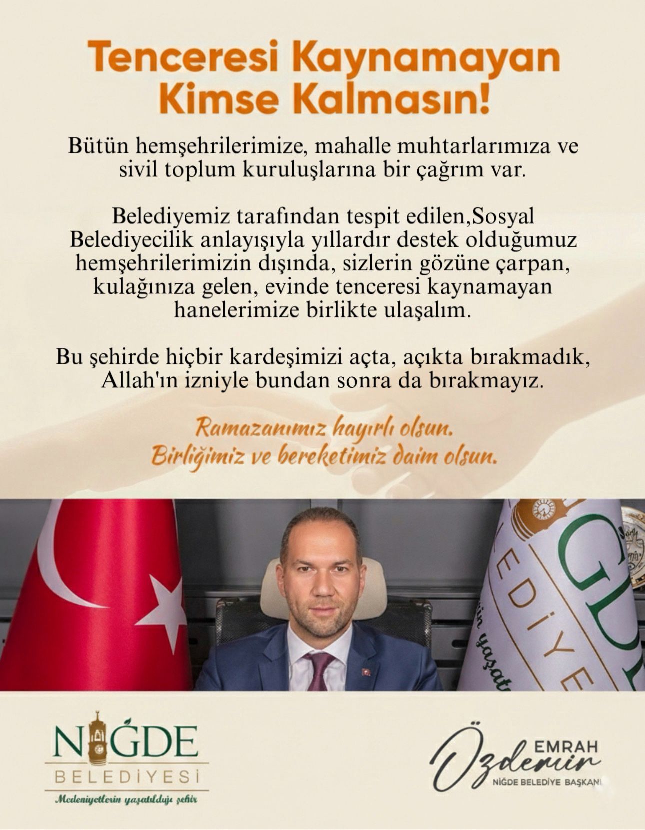 Niğde Belediye Başkanı Emrah Özdemir, yaklaşan Ramazan ayı öncesinde şehirdeki dayanışma ruhunu güçlendirmek adına tüm vatandaşlara, mahalle muhtarlarına ve Sivil Toplum Kuruluşlarına (STK) çağrıda bulundu. Başkan Özdemir; “Bizim ulaşamadığımız, gözden kaçan ihtiyaç sahiplerini bize bildirin, bu Ramazan’da kimseyi mahzun bırakmayalım” dedi.