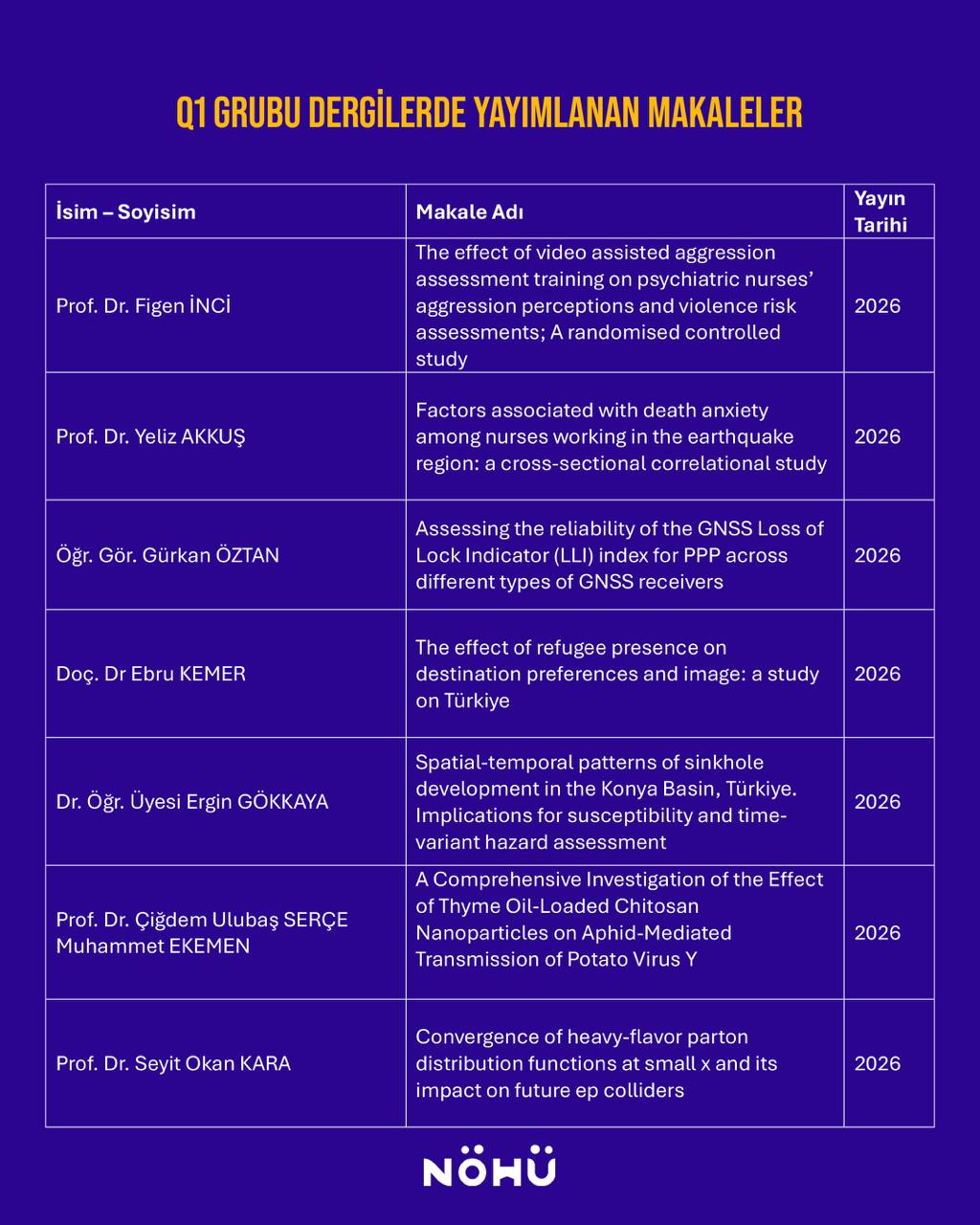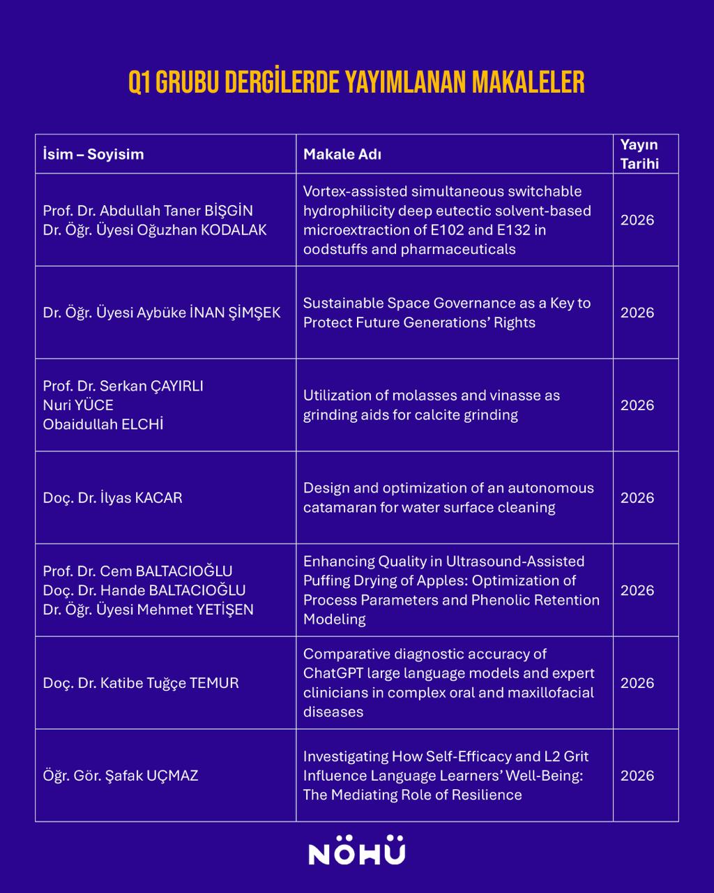Niğde Ömer Halisdemir Üniversitesi akademisyenlerinin Ocak 2026’da yayımlanan 14 makalesi, alanlarının en saygın bilimsel yayınları arasında yer alan Q1 kategorisindeki uluslararası dergilerde yer aldı.
